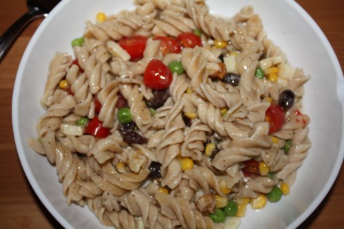 After I stretched, used my marathon stick a bit and showered, I took a mini nap. When I woke up, Hubby started dinner. As my marathon training has gotten more intense, with longer runs during the week and weekend, I have been lucky that Hubby has been cooking dinner more often. Thanks Hubs!! He made a pasta dish with a meat sauce (using venison meat).